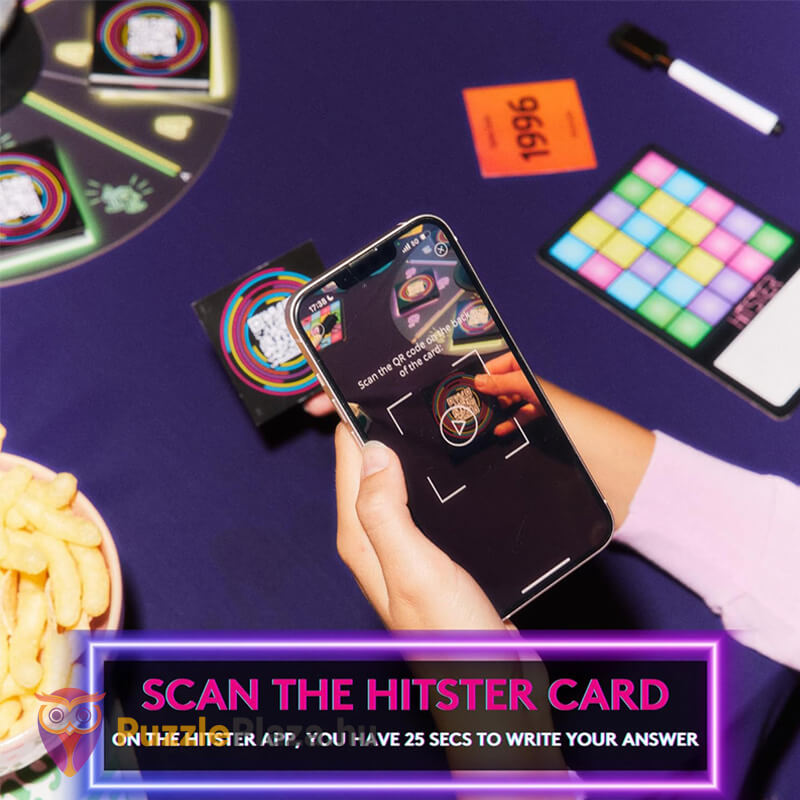 – hozzáférés a Hitster alkalmazáshoz, amely a kártyák QR-kódjait leolvassa és megszólaltatja a dalokat.